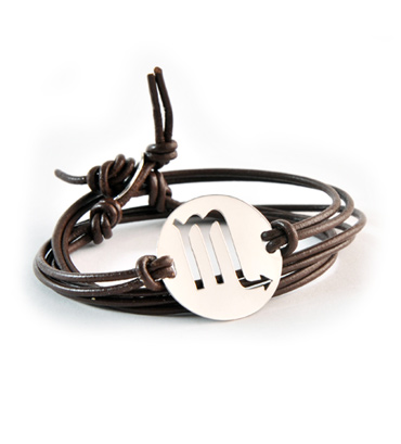 18k white gold Large zodiac Scorpio symbol set on a dark brown leather cord bracelet. *All zodiac sign available in yellow, rose and white gold. Leather cord is available in red, dark brown and black.