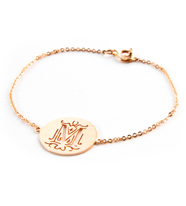 18k rose gold small initial set on a 14k rose gold bracelet.