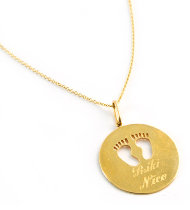 This necklace is a fashionable way to carry your baby’s names close to your heart! Baby footprints pendant in 18k yellow gold set on a 14k yellow gold chain.