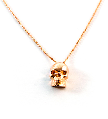 18k rose gold skull set on a 14k rose gold chain.