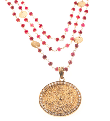 Three string gold dipped silver and ruby necklace with gold dipped silver medallion with cubic zirconea